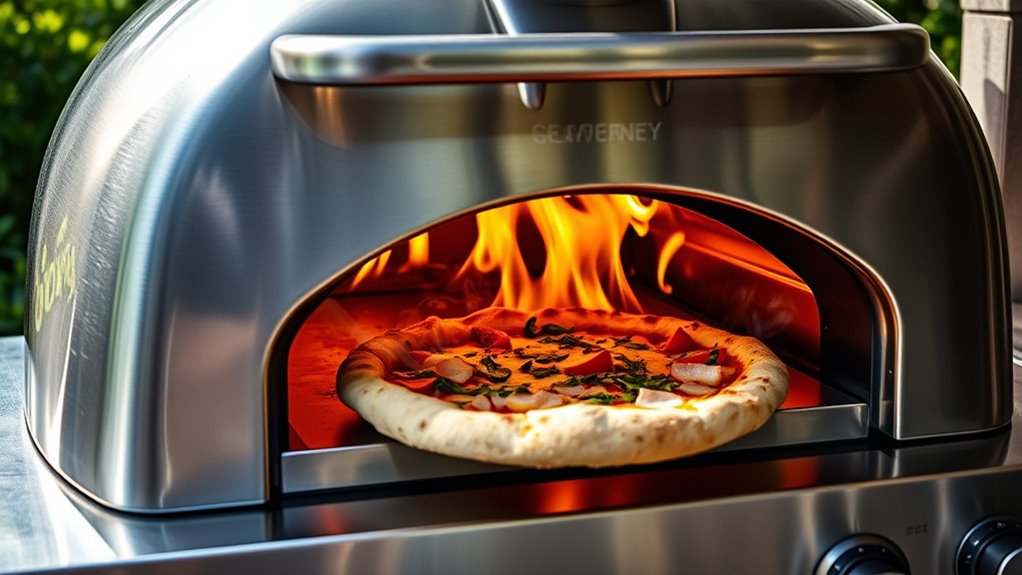 When you use a Gozney natural gas oven, you’ll notice how precise temperature control leads to consistent cooking results. The even heat distribution from its rolling lateral flame design guarantees that your pizzas bake uniformly, giving you that perfectly crisp crust every time. This allows you to achieve perfectly blistered crusts, similar to those made in traditional brick ovens, enhancing your pizza-making experience.