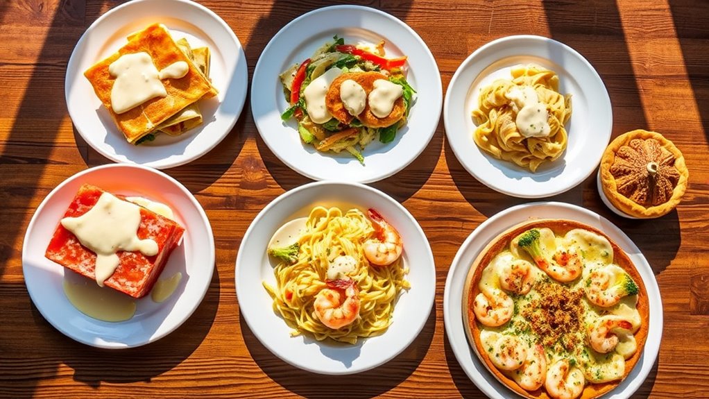 You can make five delicious dishes using jarred white sauce, making meal prep easy. First, try Chicken Alfredo Casserole, which combines pasta, chicken, and cheese. Second, Tuna Alfredo Casserole is quick and budget-friendly, featuring canned tuna. Third, Chicken Florentine pairs chicken with spinach and parmesan. Fourth, try Crock Pot Chicken and Shrimp Alfredo for a hearty, slow-cooked meal. Finally, Chicken Meatball Alfredo offers a comforting twist on pasta. Each dish provides simplicity and flavor, so you can simplify your dinner plans.