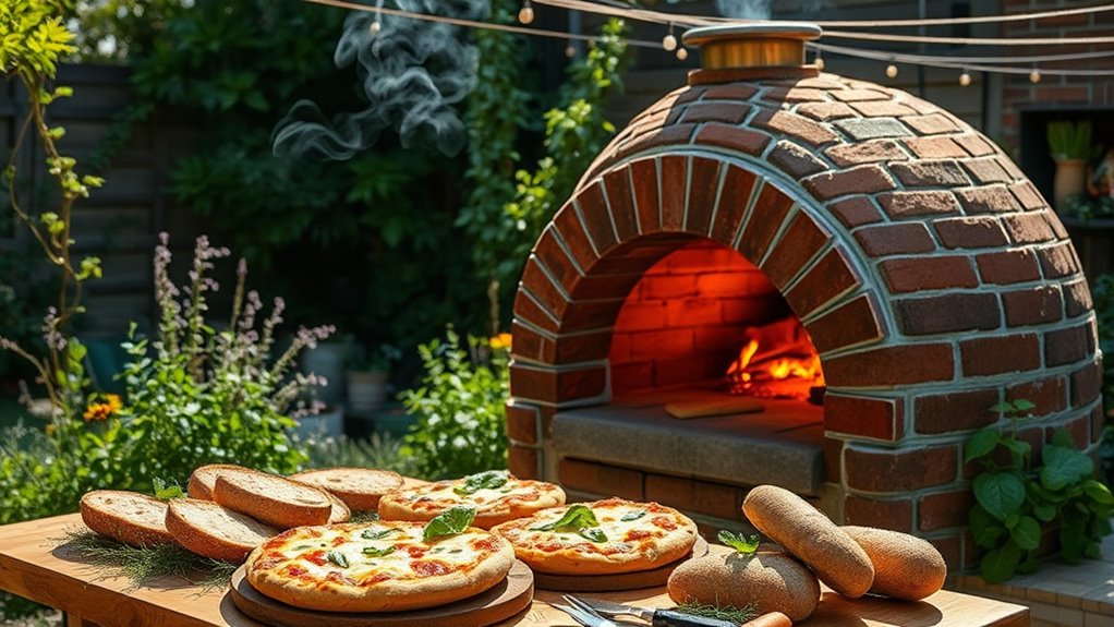 When you cook with a wood-fired oven, you’ll notice a distinctive smoky aroma that enhances the flavor of your dishes. The high temperatures create a charred finish on pizzas and other foods, adding depth and complexity that gas ovens simply can’t match. Additionally, cooking with natural wood fuel in a brick oven is known for its healthier alternative to gas or electric cooking, preserving food nutrients better due to rapid, high-heat cooking.